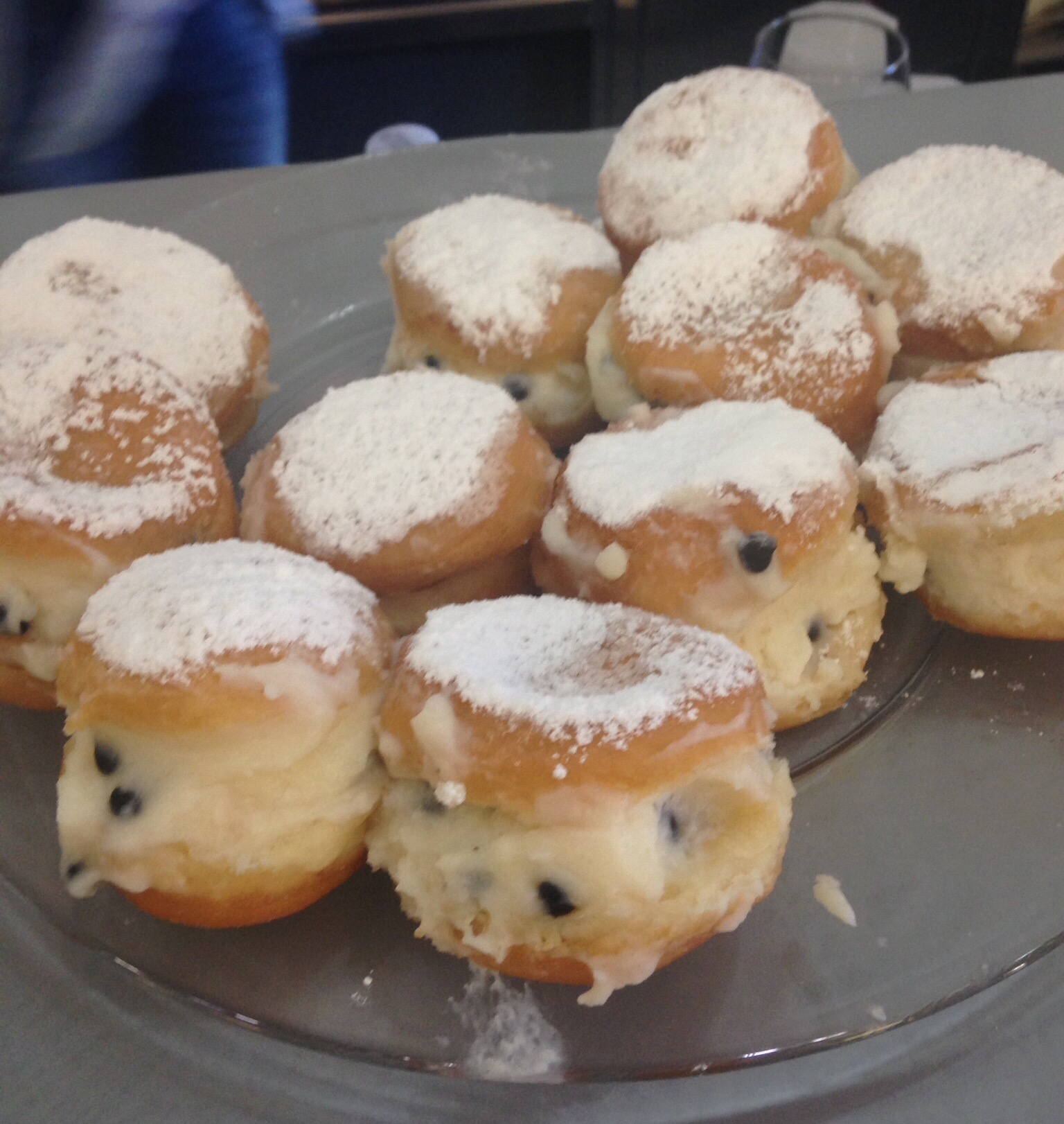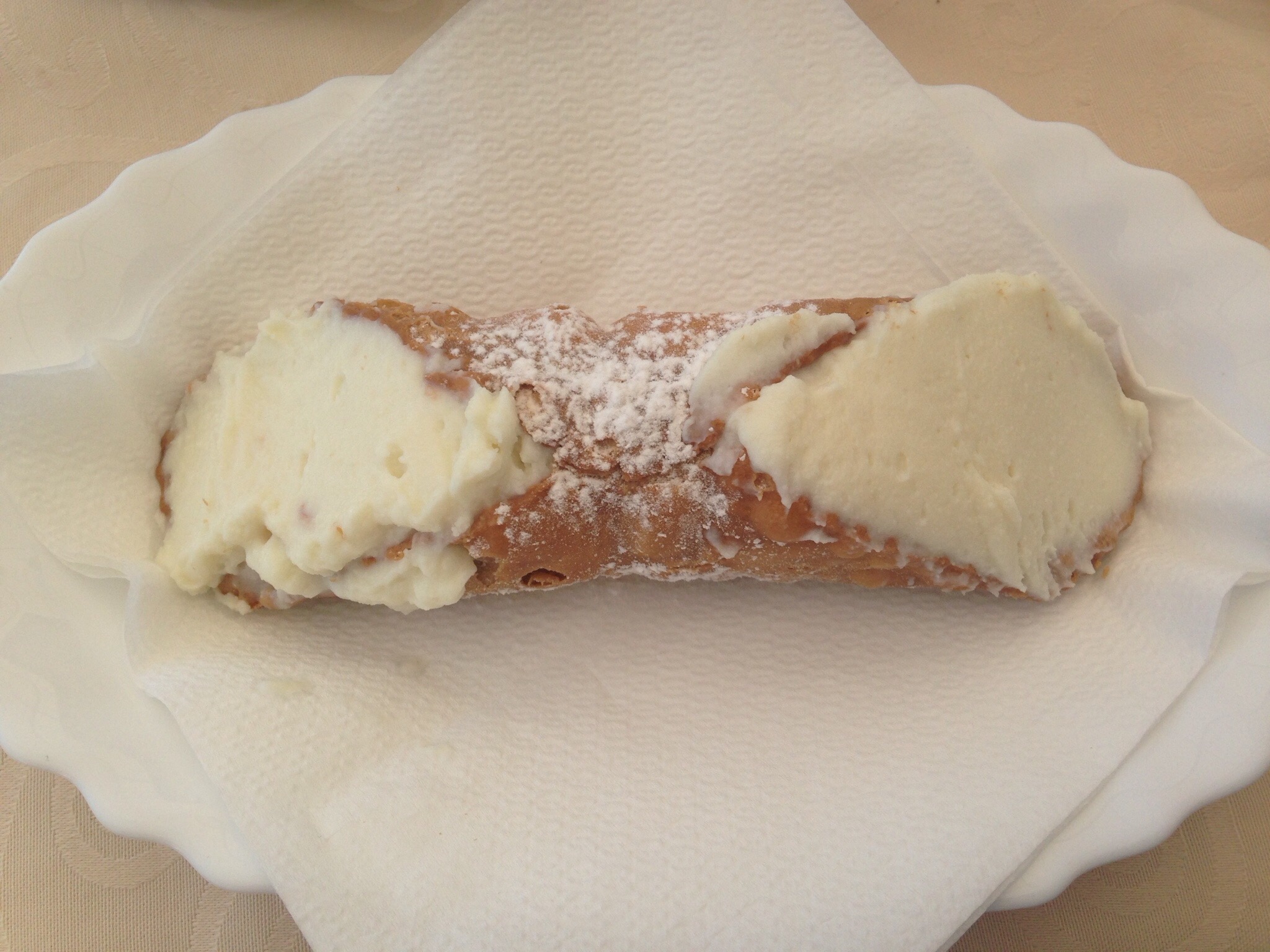 This is the famous Genovese from Erice only! A cookie pastry filled with milk custard and dusted with powdered sugar. Amazing when hot out of the oven!