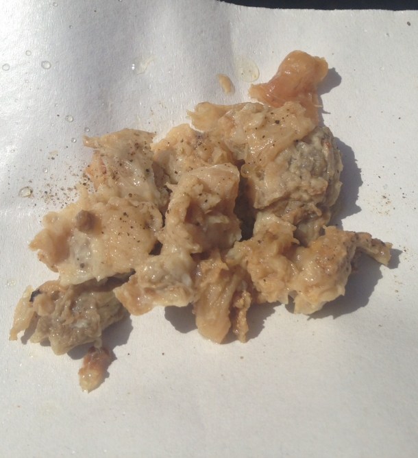 Veal cartilage and fat here is breaded and deep fried and available only in the markets! Served on a sandwich roll usually.
