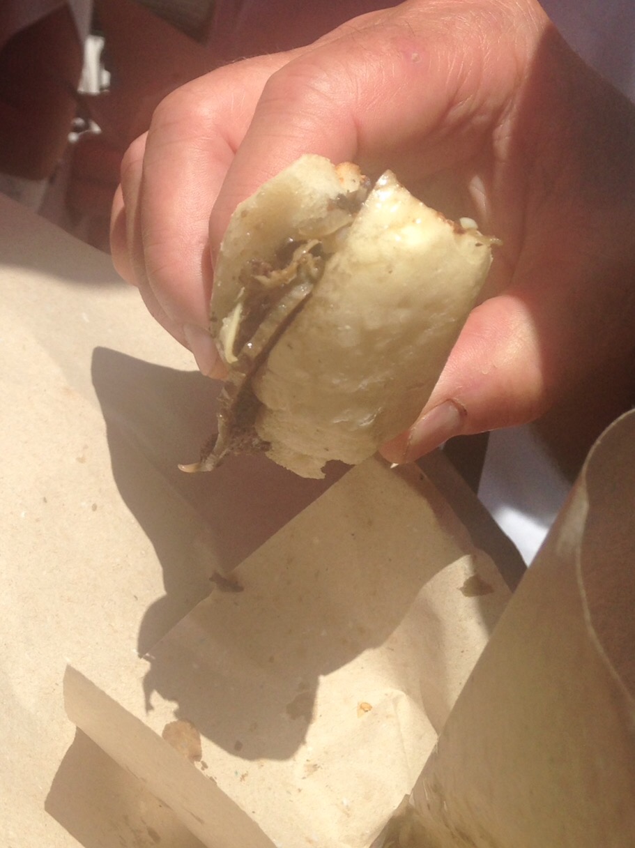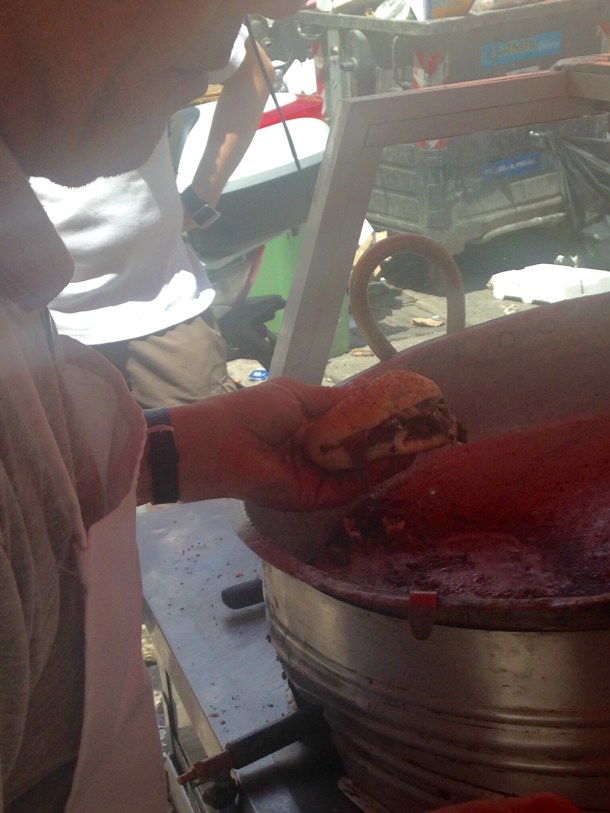 Beef spleen braised in a sauce and sandwiched in a soft bun, another market food cart. Pane cá Meusa