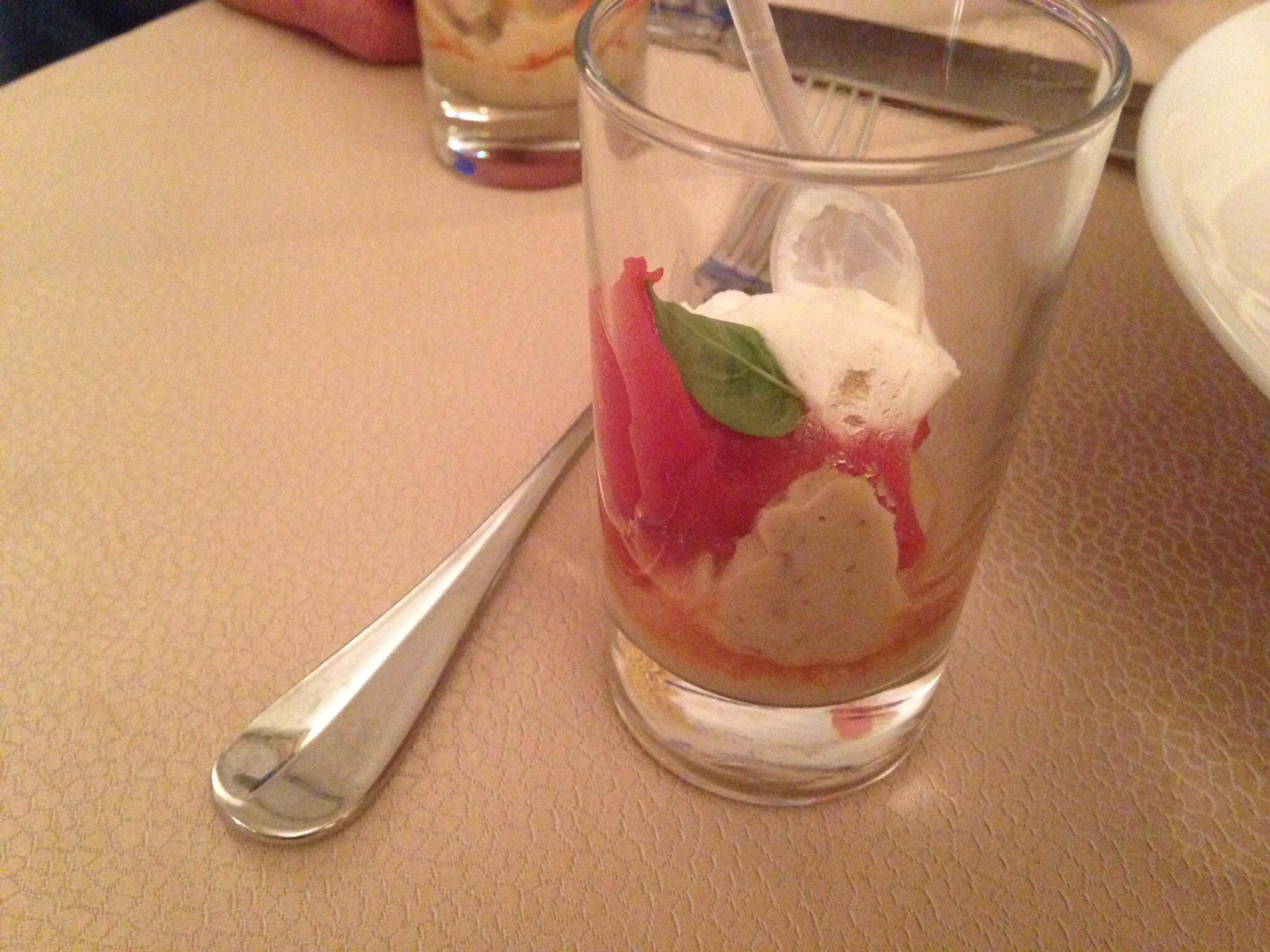 Intermezzo of puréed eggplant, sweet tomato and strawberry purée, ricotta and mint