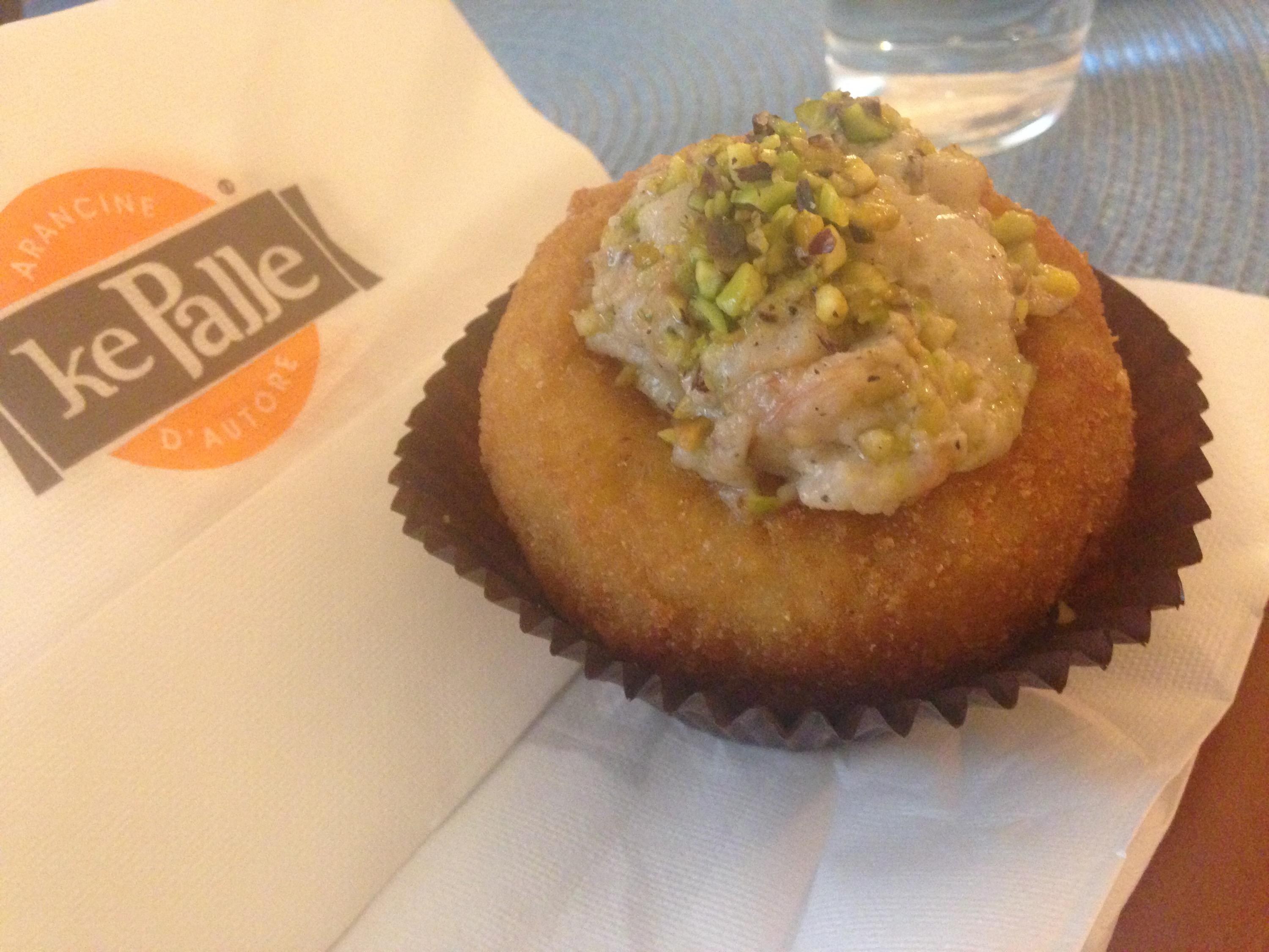 A gourmet arancine filled with seafood and pistachio.