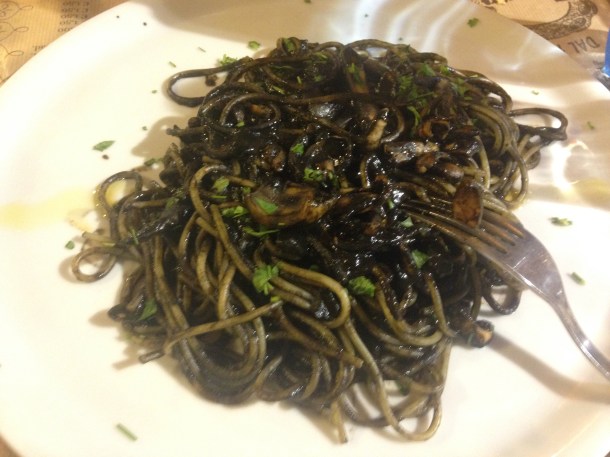 Squid ink and calamari on spaghetti